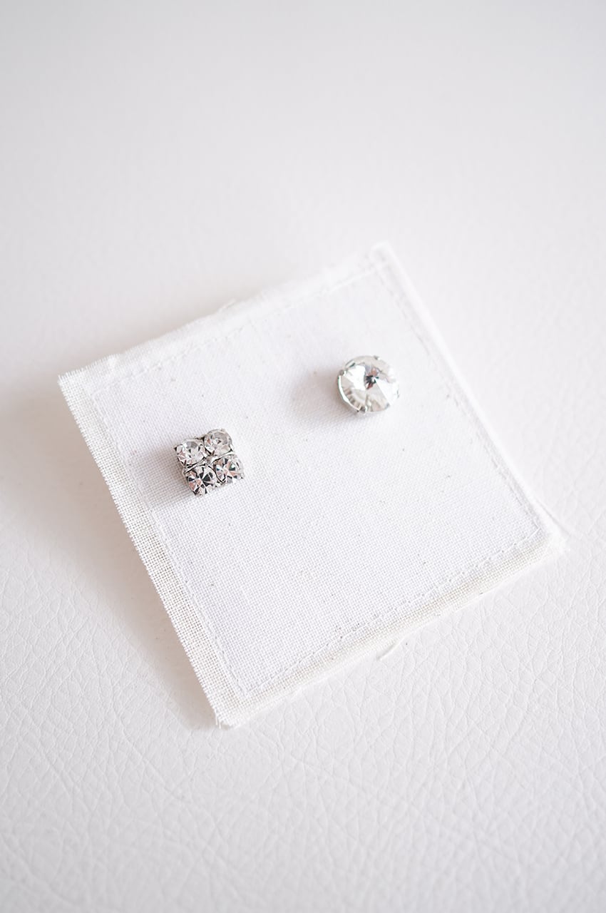 顔まわりがパッと華やぐ、形の異なるラインストーンシルバーピアスセット。 存在感のある大人可愛いアクセサリー。