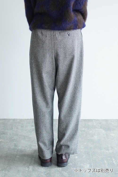 程良いハリと肉感が特徴のクラシカルな印象のヘリンボーンツイードを使用したワイドテーパードパンツ。深くたたんだフロントタックからなるワイドシルエットと、裾にかけてテーパードさせたラインがモード感のある雰囲気を醸し出します。シックでマニッシュな印象がシーズンムード高める一着です。